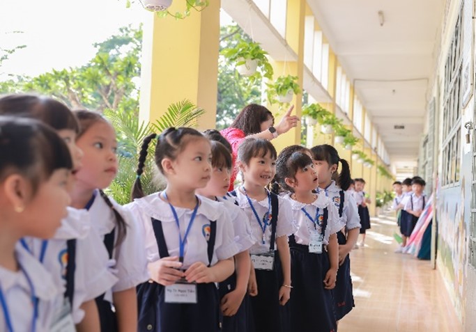 Các cô giúp học sinh làm quen với trường lớp, thầy cô và bạn bè; ổn định tổ chức lớp, chia tổ, bình bầu cán sự. Giáo viên cũng dẫn các em các phòng chức năng, phòng y tế, nhà vệ sinh và cách sử dụng .... để học sinh biết vị trí và khi nào cần thì đến đó. Bên cạnh đó giáo viên giới thiệu nội quy trường lớp, cách chào hỏi, xin phép khi ra vào lớp, hướng dẫn các em chỗ để cặp, sách, đồ dùng…. Giáo viên giúp học sinh nhận biết và làm quen với các ký hiệu học tập như: Ký hiệu ngôn ngữ cơ thể (ngồi ngay ngắn, không nói chuyện, không làm việc riêng, tư thế phát biểu…), ký hiệu gõ thước ở bảng lớp (lấy và cất vở, sách, đồ dùng; đọc cá nhân, nhóm, tổ…). Từ đó hình thành cho các em tác phong nhanh nhẹn, mạnh dạn, nề nếp và kỉ luật.