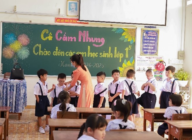 Những nụ cười tươi tắn, lời hỏi han, động viên của các thầy cô đã để lại những ấn tượng tốt đẹp trong lòng các con và phụ huynh về một ngôi trường thân thiện. Cảm giác hồi hộp, lo lắng của các bạn nhỏ nhanh chóng tan biến, thay vào đó là niềm vui, sự phấn khởi, bởi hôm nay các con chính thức trở thành học sinh lớp 1. Bài học đầu tiên trong ngày đầu tiên đi học ở bậc học mới cũng là những bài học cơ bản nhất, dưới sự hướng dẫn tận tình của cô giáo.