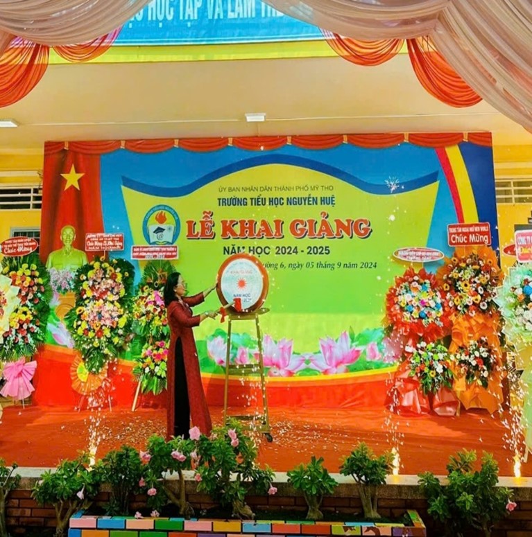 Cô Nguyễn Thị Nhung - Bí thư chi bộ, Hiệu trưởng nhà trường đọc diễn văn khai giảng, đánh trống khai trường và thông qua nhiệm vụ trọng tâm năm học.