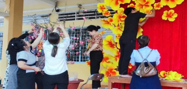 Không chỉ là công việc chuẩn bị cảnh trí, buổi chung tay “gọi tết về” còn là dịp để thầy cô thêm gắn bó, sẻ chia và cùng nhau lan tỏa tinh thần đoàn kết. Tiếng cười nói rộn ràng xen lẫn sự tập trung, khẩn trương đã làm cho không khí xung quanh trở nên gần gũi, thân thương hơn bao giờ hết.