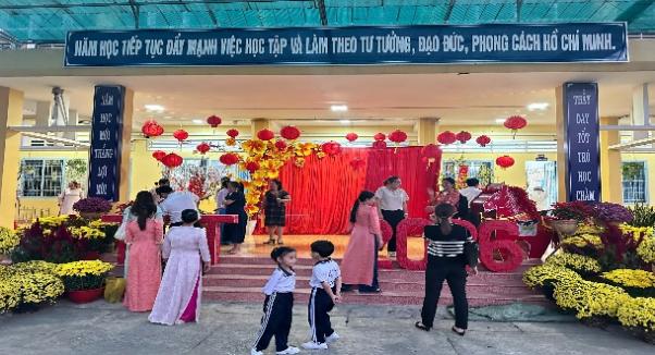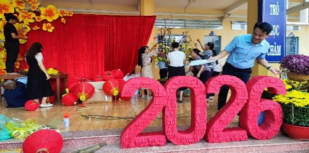 Sáng ngày 30/01/2026, sân trường Tiểu học Nguyễn Huệ bỗng rộn ràng hơn hẳn khi mùa xuân như ghé thăm sớm. Trong không khí náo nức ấy, thầy cô nhà trường cùng nhau tất bật chuẩn bị cảnh trí, mang sắc xuân lan tỏa khắp khuôn viên trường.