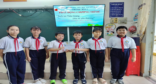 Trong thời gian qua, các tỉnh phía Bắc đã hứng chịu sự ảnh hưởng nặng nề cơn bão số 3 (siêu bão Yagi) những trận mưa lớn dồn dập, những trận lũ lụt kinh hoàng đã gây ra những thiệt hại nặng nề về người và tài sản cho đồng bào nơi đây. Căn cứ vào Công văn số 712 -CV/ĐTN ngày 17/9/2014 của Ban Thường vụ Thành Đoàn Mỹ Tho, nhằm tuyên truyền giáo dục tới học sinh trong nhà trường phát huy truyền thống tốt đẹp của dân tộc tinh thần “tương thân tương ái” cùng chung sức đồng lòng ủng hộ đồng bào miền Bắc, Liên đội trường Tiểu học Nguyễn Huệ đã phát động chương trình “Tuổi trẻ Tiền Giang chia sẻ yêu thương” vận động ủng hộ khắc phục thiệt hại do cơn bão số 3 gây ra.