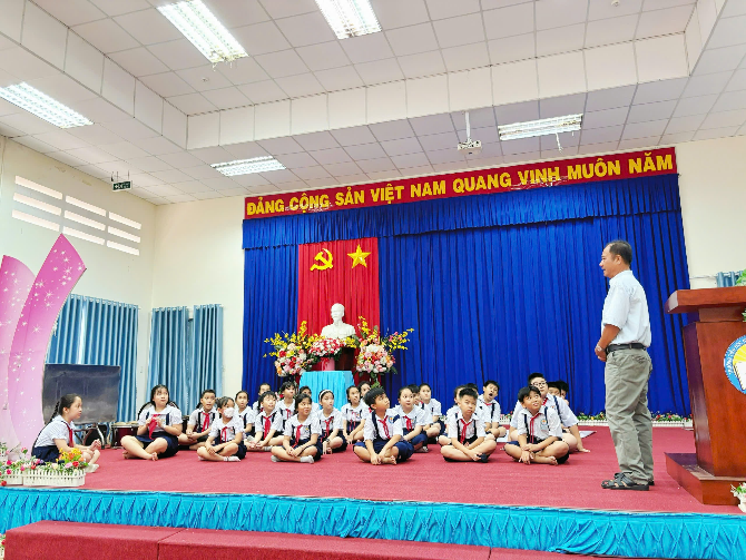 Thầy Lê Quốc Tuấn - TPT Đội - thực hiện tiết Sinh hoạt Sao Nhi đồng | Sinh viên Trần Thị Minh Thơ - thực giảng tiết dạy Tiếng Việt lớp 1 |